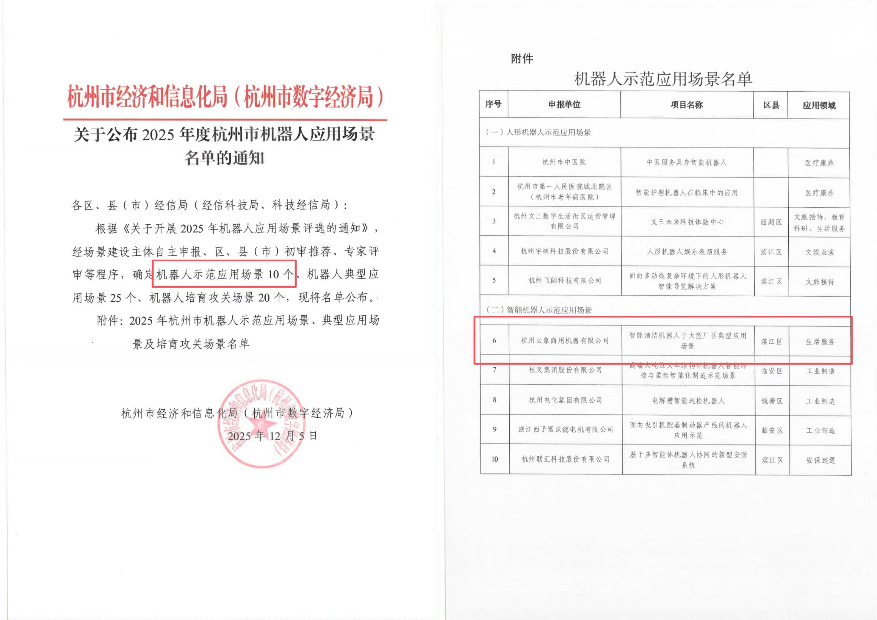 近日,杭州市經濟和信息化局發布《關于公布 2025 年度杭州市機器人應用場景名單的通知》,杭州云象商用機器有限公司申報的“智能清潔機器人于大型廠區典型應用場景”成功入選智能機器人示范應用場景名單。